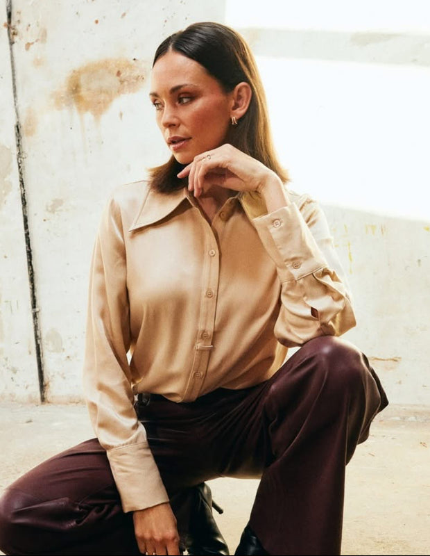 Style den flotte skjorte med de lækre bukser i farven Taupe finde dem HER